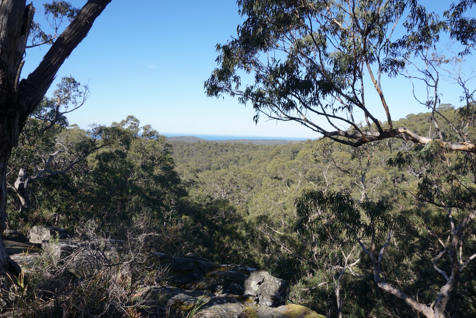 We then took the left branch up the hill and climbed steadily to a rock platform that looks out over the Ironbark gorge below. We stopped here for a drink and a snack to enjoy the view over the valley and the sea.