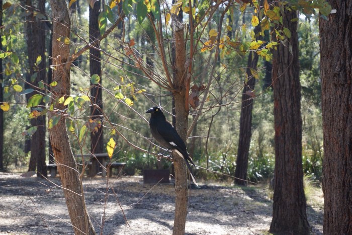 Birds we saw: One eastern yellow robin sitting on a branch watching patiently for prey. Lots of fantails and numerous small birds flitting over head. Two very cheeky currawongs that arrived as soon as we sat on the picnic tables for lunch. They received our pear cores for their patience. They didn’t seem impressed.