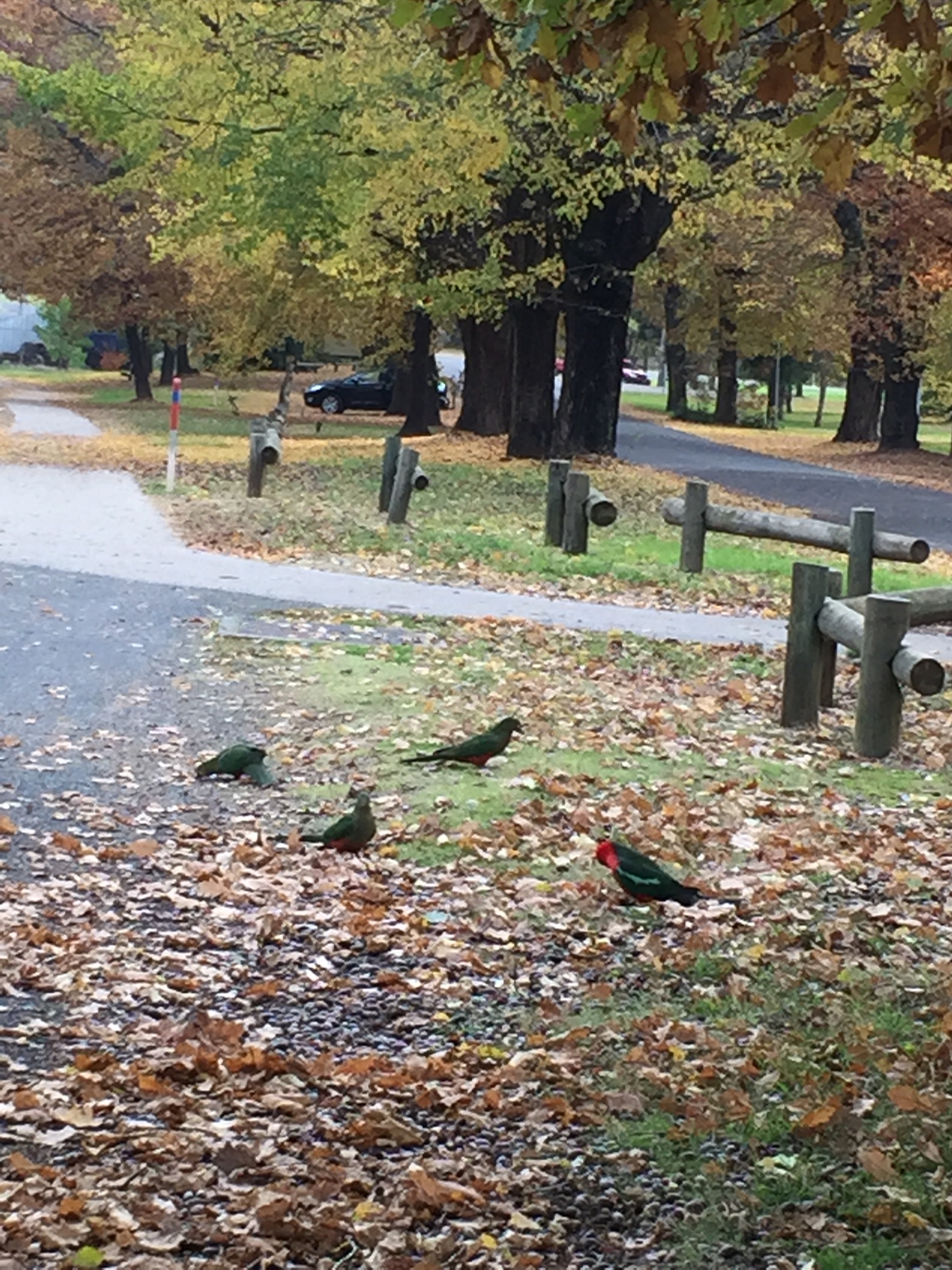 We headed up through the town and to the site of the old timber mill and rail yards. This now forms a park and museum, and the start of the tail trail. Although most of the European trees had shed their leaves for autumn, this area was still beautiful. We were treated to a tribe of king parrots feeding in a fruiting oak tree. Waves of them kept landing briefly to take up an acorn, retuning to the low branches to nibble, dropping the husk then flying down again. We stood under the oak for about fifteen minutes, grinning like loons as these beautiful large parrots repeatedly swioped down to our feet and fed.