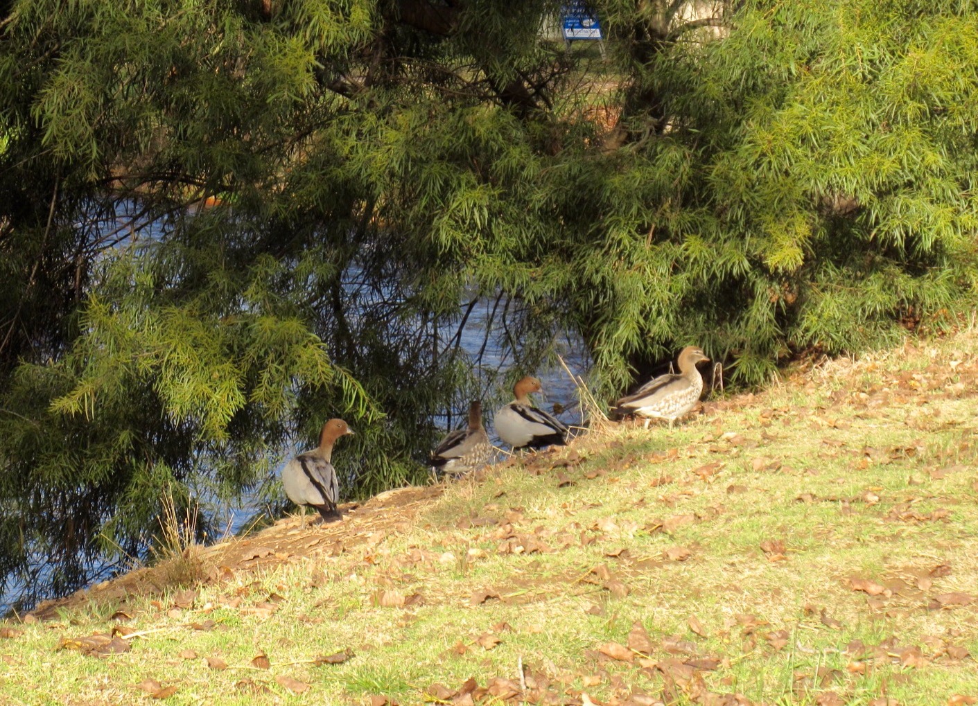 We crossed over the river in the park area behind the town, and walked outwards along the northern bank. Lots of birds again: currawongs, king parrots, galahs feeding on the grass, lots of wood ducks, crimson rosellas, a family of bowerbirds this time (on the lawn in someone’s backyard, superb fairy wrens, pacific black ducks, black cockatoos high in the eucalypts preening and calling to each other.