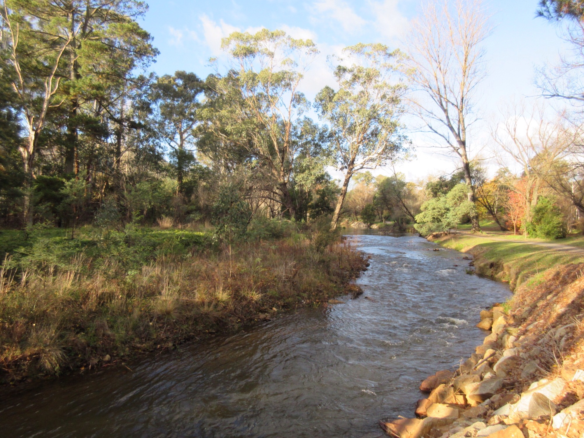 We crossed over the river in the park area behind the town, and walked outwards along the northern bank. Lots of birds again: currawongs, king parrots, galahs feeding on the grass, lots of wood ducks, crimson rosellas, a family of bowerbirds this time (on the lawn in someone’s backyard, superb fairy wrens, pacific black ducks, black cockatoos high in the eucalypts preening and calling to each other.