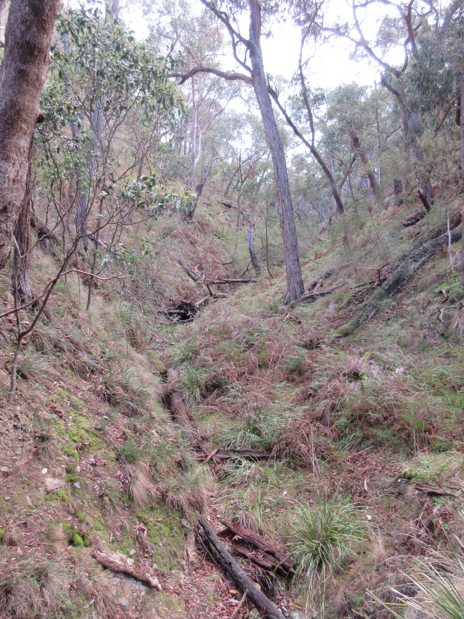 At around the half way point of the walk, we left Slate track and headed down a well marked foot track that snaked down the side of a gorge and past old slate mining digs. At the bottom, we crossed a foot bridge and walked alongside the (at the time dry) creek bed. The messy nature of the gully and the shapes of the shore led us to wonder of the history of the creek, it looked like it had been victim to mining disruptions at some point in its past.