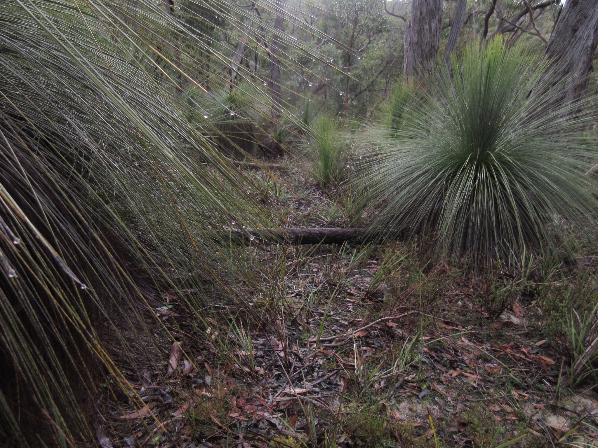 The vegetation was really interesting: open forest with very little shrubby undergrowth, and a scattering of beautiful grass trees. Sadly, some of the grass trees have succumbed to cinnamon rust and died, there were warningsregarding straying off track and spreading the fungus. In the morning light, the grasstrees were all dangling little droplets on the ends of their leaves. It reminded me of our bamboos, so I wondered if it was the same guttation effect. On one of the sections of Kangaroo track, we kept seeing this low almost prostrate shrub with holly-like leaves that we did not recognise at all. After some research it seems like we were seeing the Brisbane Ranges Grevillea, albeit not in flower at this time of year.