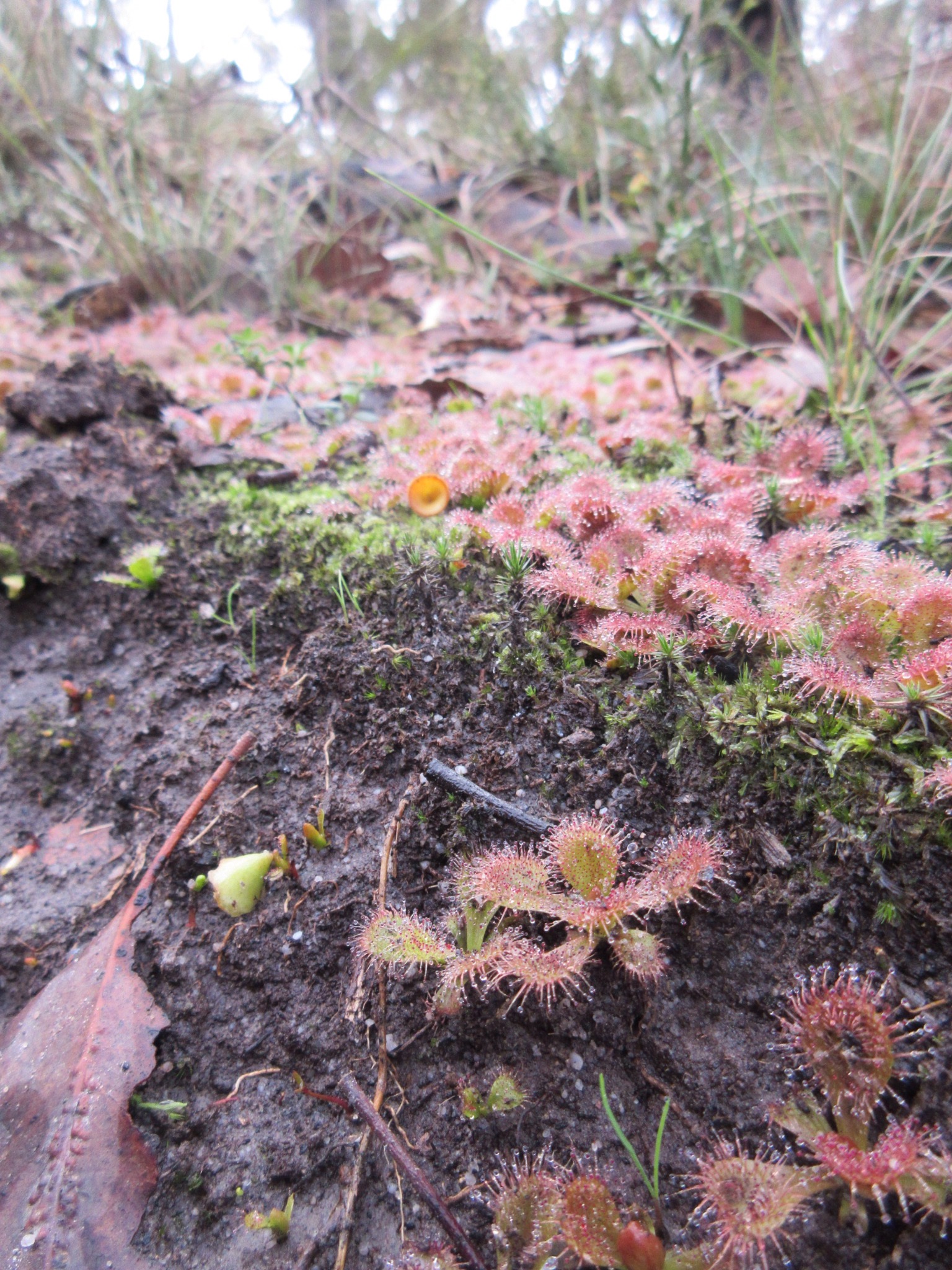We then turned off the creekside track, scrambling over a fallen tree and climbed steeply up out of the gorge. At the top, we crossed over a road and headed back into the forest, once again on 4wd tracks and back northwards, generally following Little River. The vegetation was different again in the valley, it was here that we noticed that the track was often flanked on both sides by a blush mat of sundews. We continued on the Little River track, passing the Link track intersection and then retraced our trail back to the car. When of course, it started to drizzle on us!