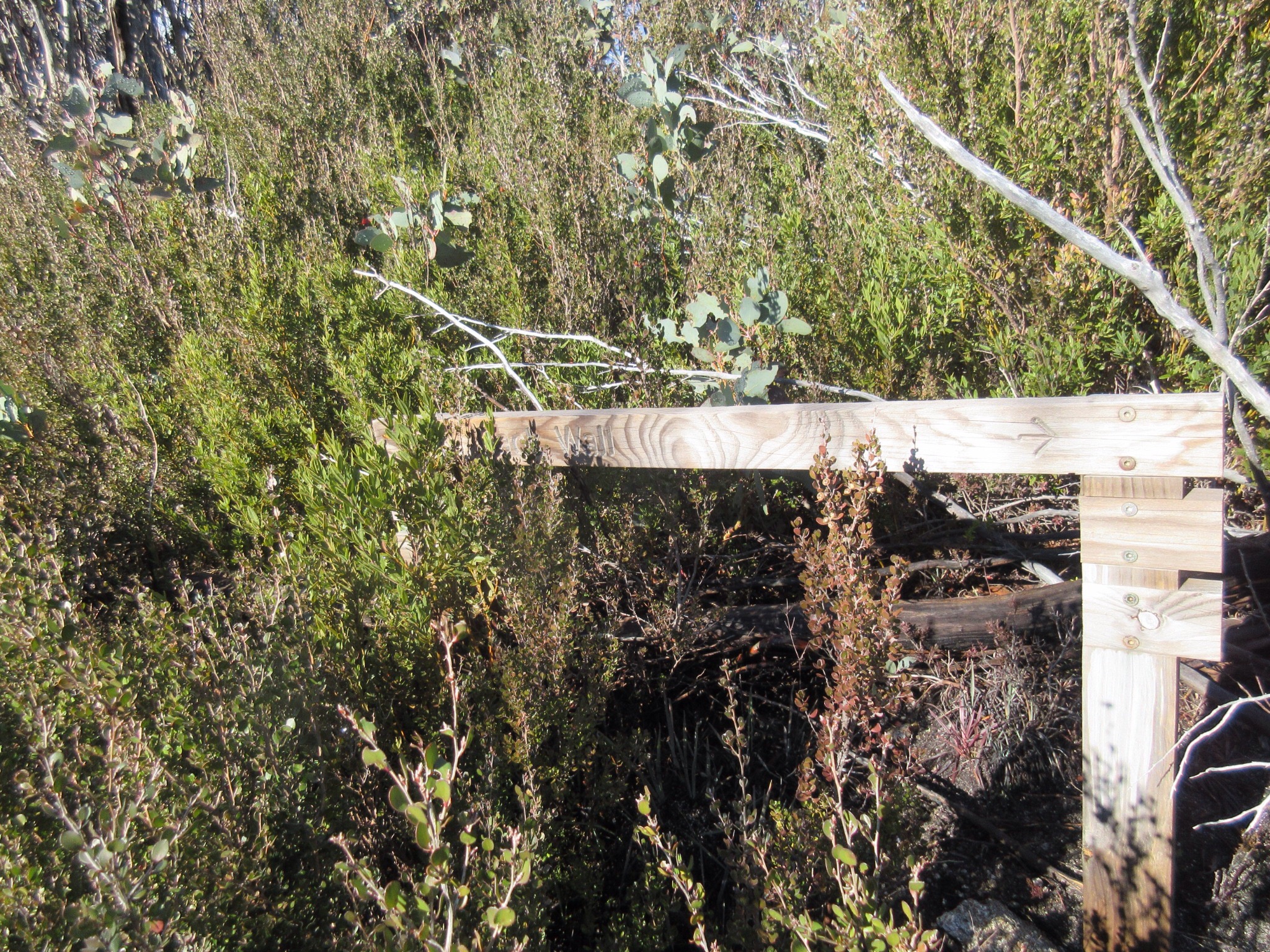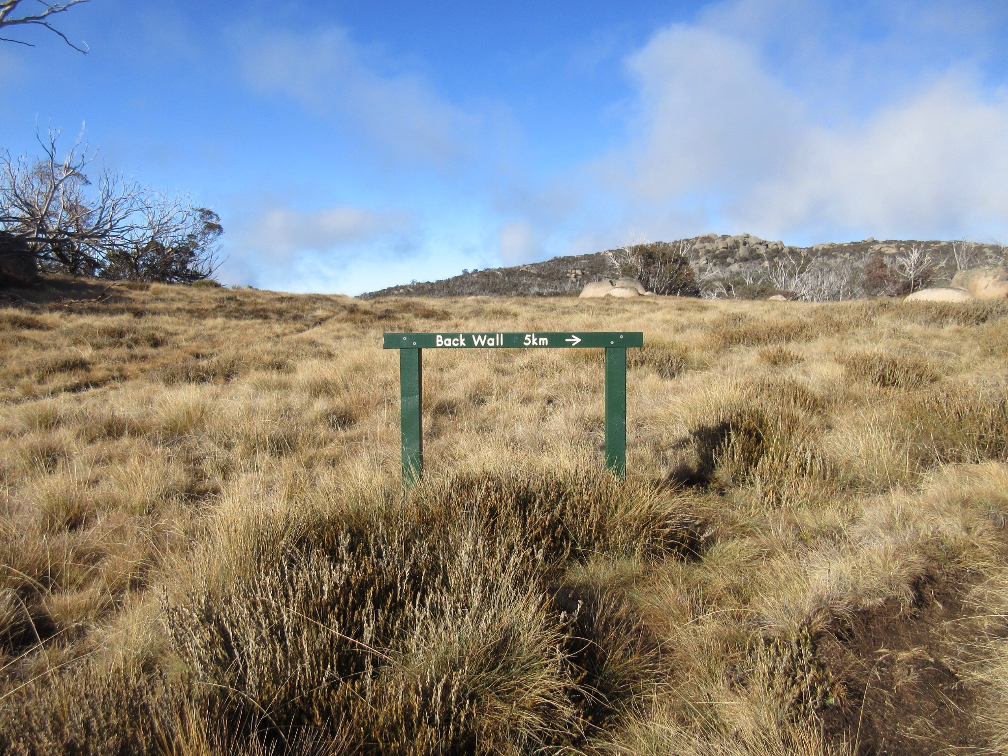 About a half way along the Back Wall track we noticed a directional sign that appeared to be at a track junction… but no junction. We weren’t expecting the track to branch (none were marked on the maps) and the sign only pointed to the Back Wall, but there were two other signs that had been ‘cut off’ the sign board, leaving only the ends. We pored over the map when we got back to Bright, and we’re pretty sure where the non-track would have pathed… but we wondered why the track has been removed.