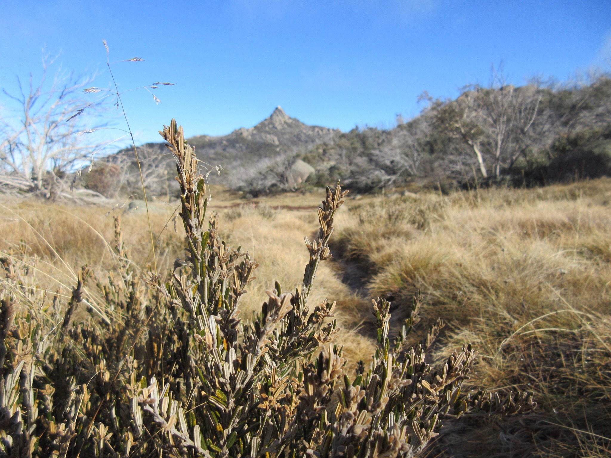 Note that we started this walk later than we wanted, due to some confusing information about the requirement for snow chains in the park. We’d read that although snow chains were required for all of the alpine areas at the moment, Mount Buffalo (being a much lower altitude/snow chance) wouldn’t have the same blanket ruling. Instead, if the forecast for the day was fine, and if now snow was currently on the peak, there’d be no need for chains – but that in any case the entrance to the park would advise one way or another. On this day the forecast was fine, and there was no snow, but regardless, the sign at the entrance required chains to be carried. We turned around and drove all the way back to Bright to hire chains, and then returned. Of course there was absolutely ZERO snow on the mountain, and the sun shone all day. The chains stayed on the back seat of the car. Useful.