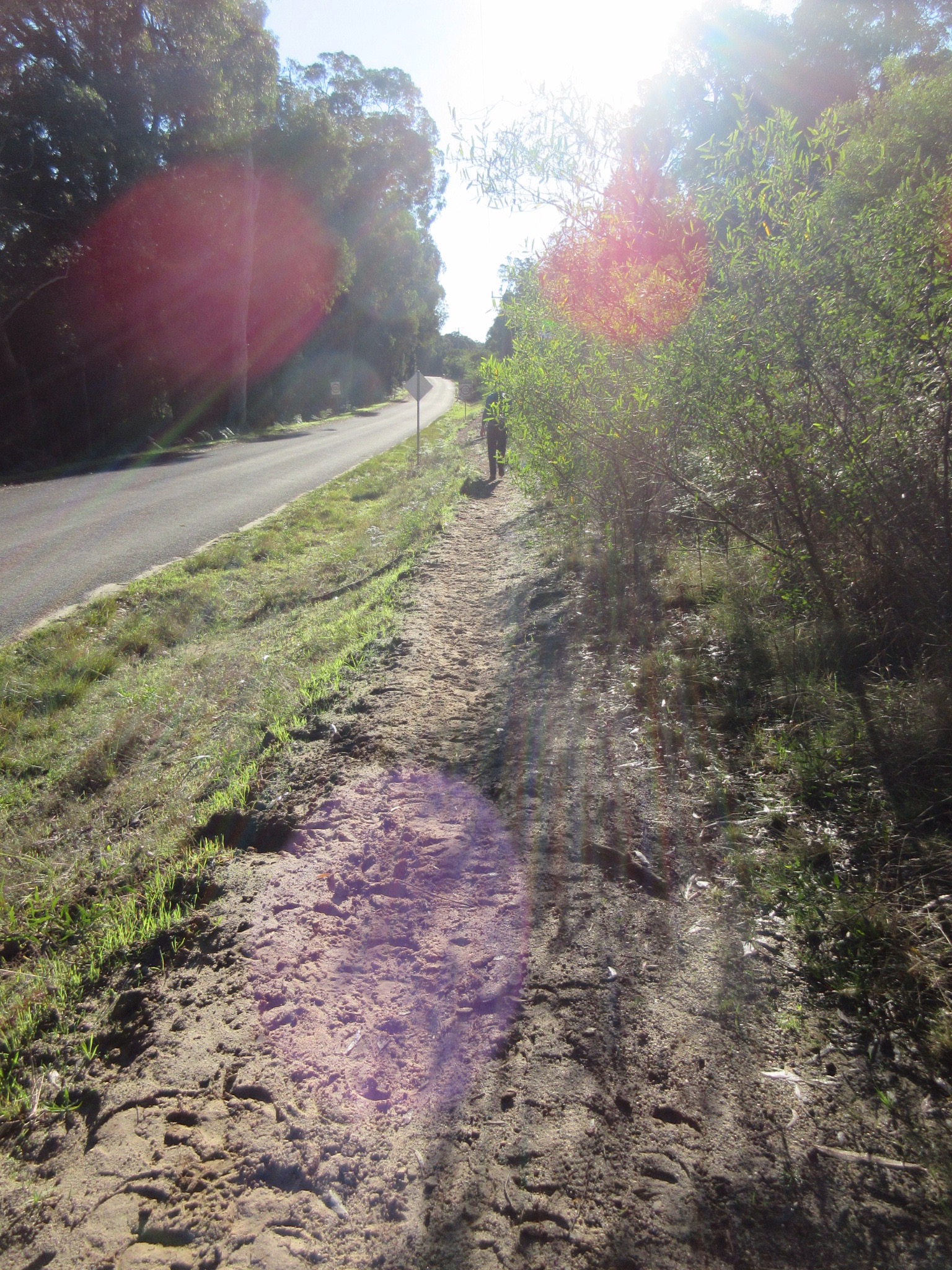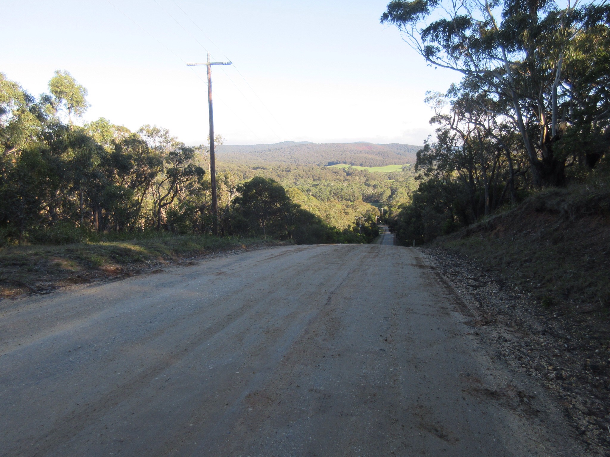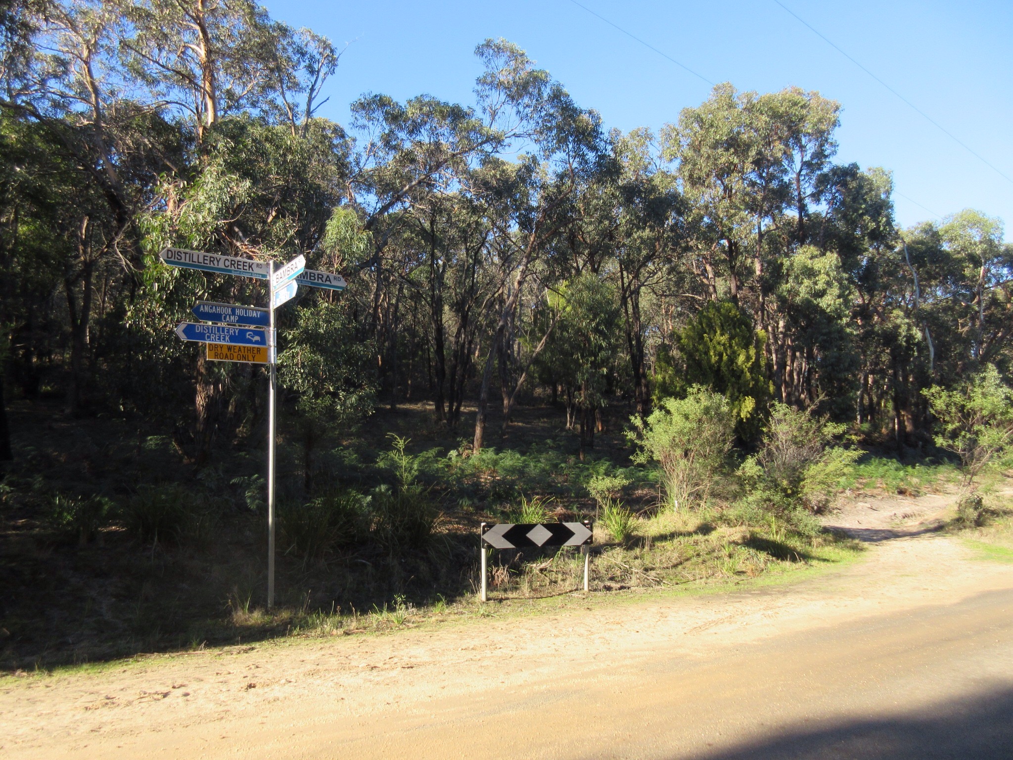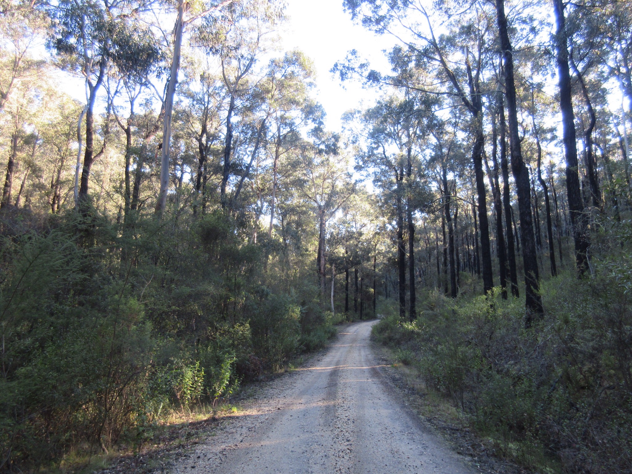Once we reached Boundary Road we turned west and trumped along the edge of the road for a while, with the occasional kangaroo bounding off into adjoining properties. We then reached Bambra road and turned north, following a hoof-print-laden track beside the road complete with a semi-continous covering of horse poo. At the turn off to Distillery creek, we crossed Bambra Road and headed west, entering the national park and making our way towards Distillery Creek picnic area.