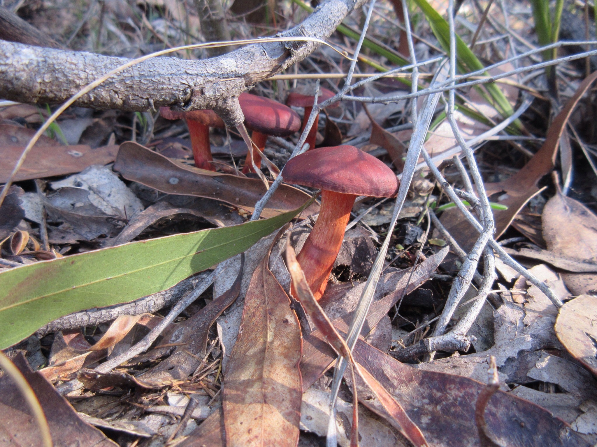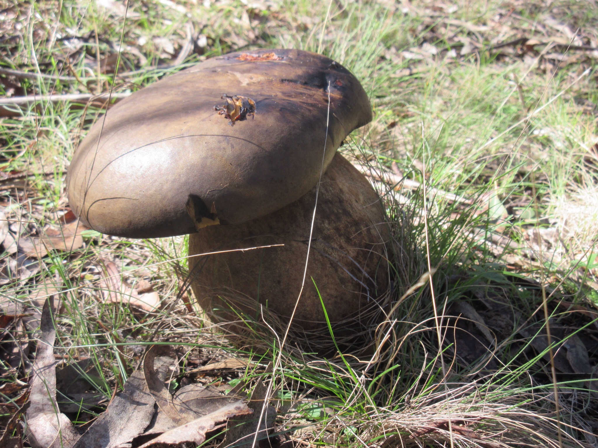 Packing up our snack, we shouldered our packs and started back up the hill, crossed the Gentle Annie track and descended on foot track once more, to Moggs creek picnic area. The picnic area is in a clearing under tall Ironbarks, it makes a beautiful place to stop for lunch. We sat and ate for a bit then wandered around the area, reading the signs and checking out the area. There were green hooded orchid patches just coming into flower, a HUGE mushroom (maybe a Phlebopus marginatus? It was certainly pored, not gilled) and crazy lichens on the tree branches (and the tables!).