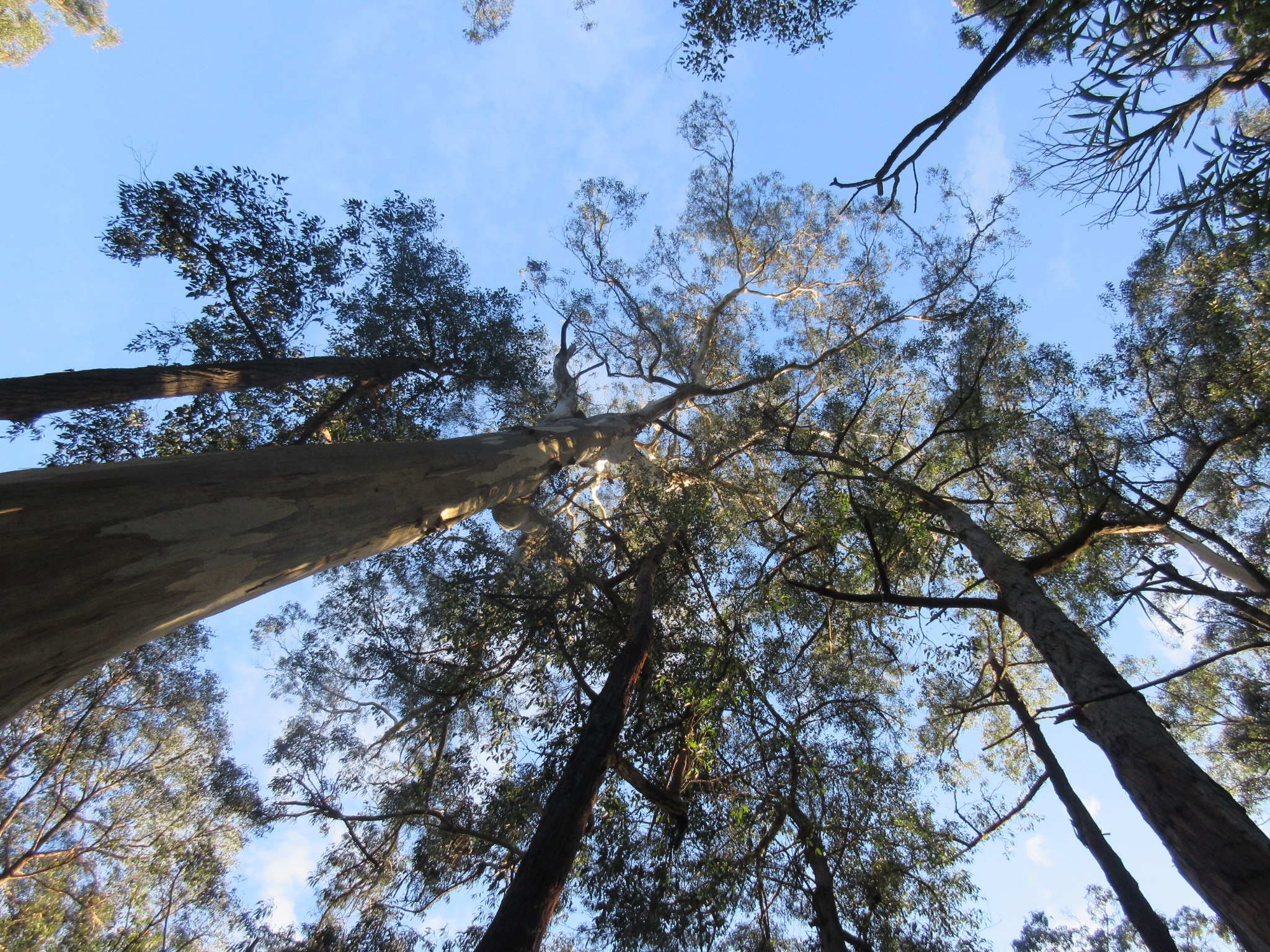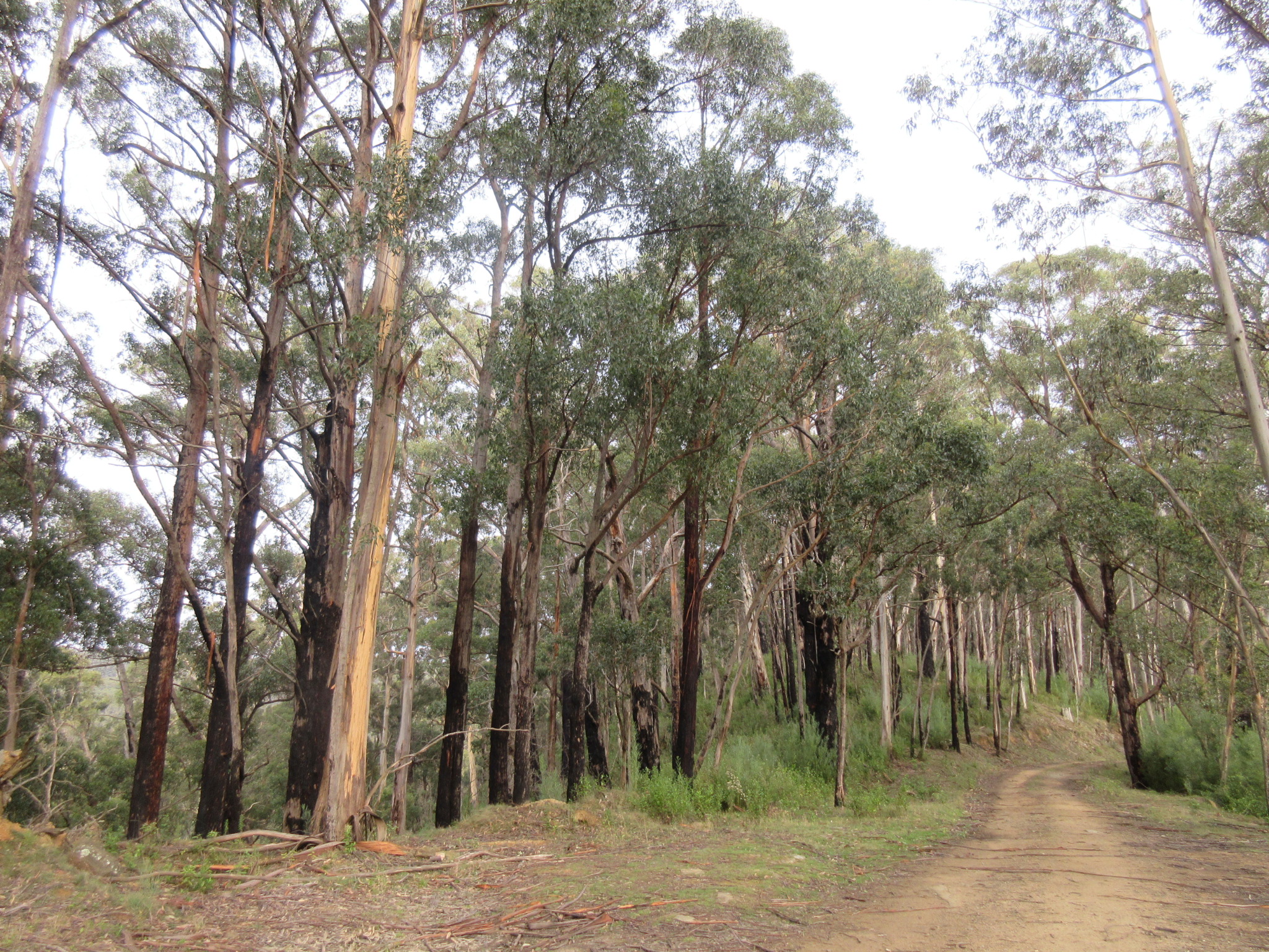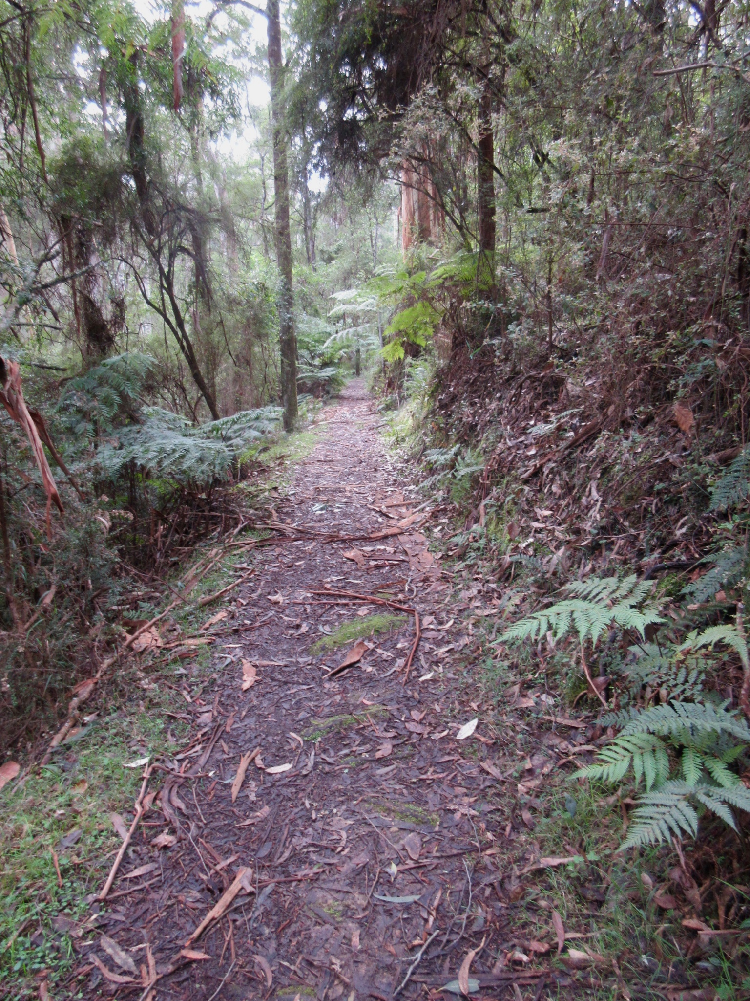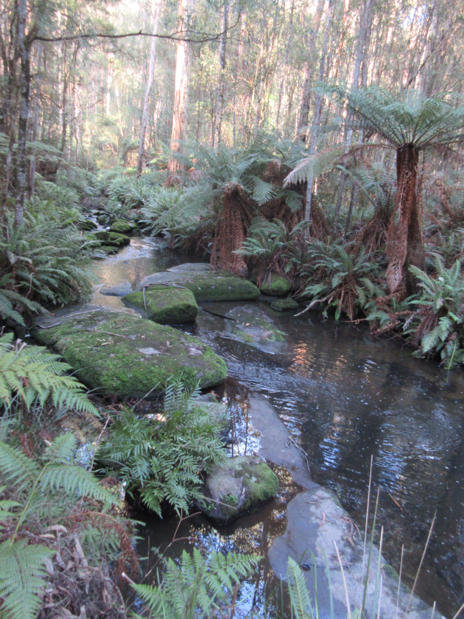 The track was clear and well marked, following alongside the creek. The area is an old logging area, and the tracks were once old horse-drawn tramways. The trails are hence fairly wide and flat and the eucalypt forest is dominated by tall, straight, fairly young trees. The leaf-strewn track was edged with ferns, herbs, mosses and fungi. The creek burbled with dark water and dense ferns curtained the northern edge.