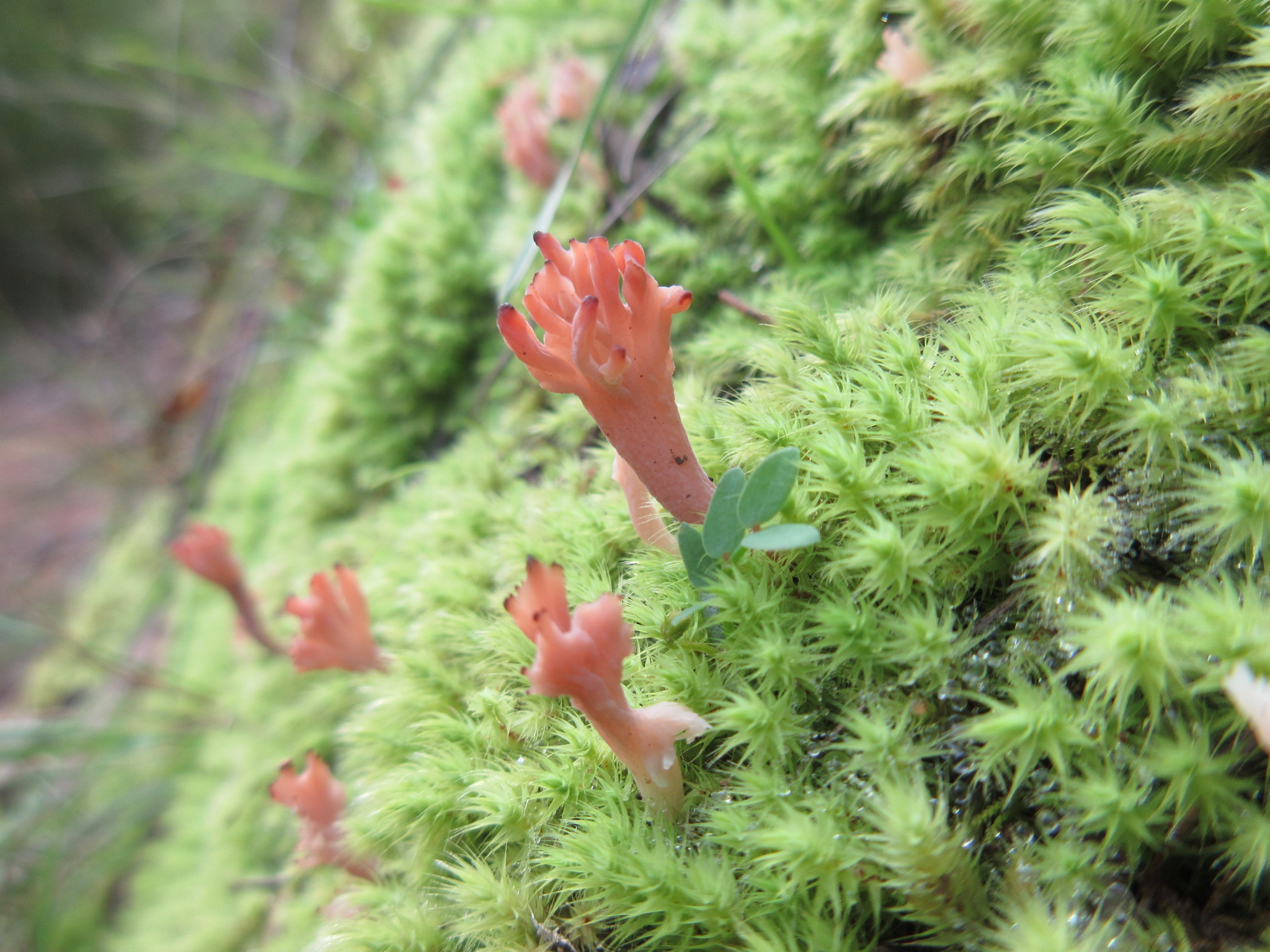The cutest coral fungi, in moss under the track junction sign on Garvey track