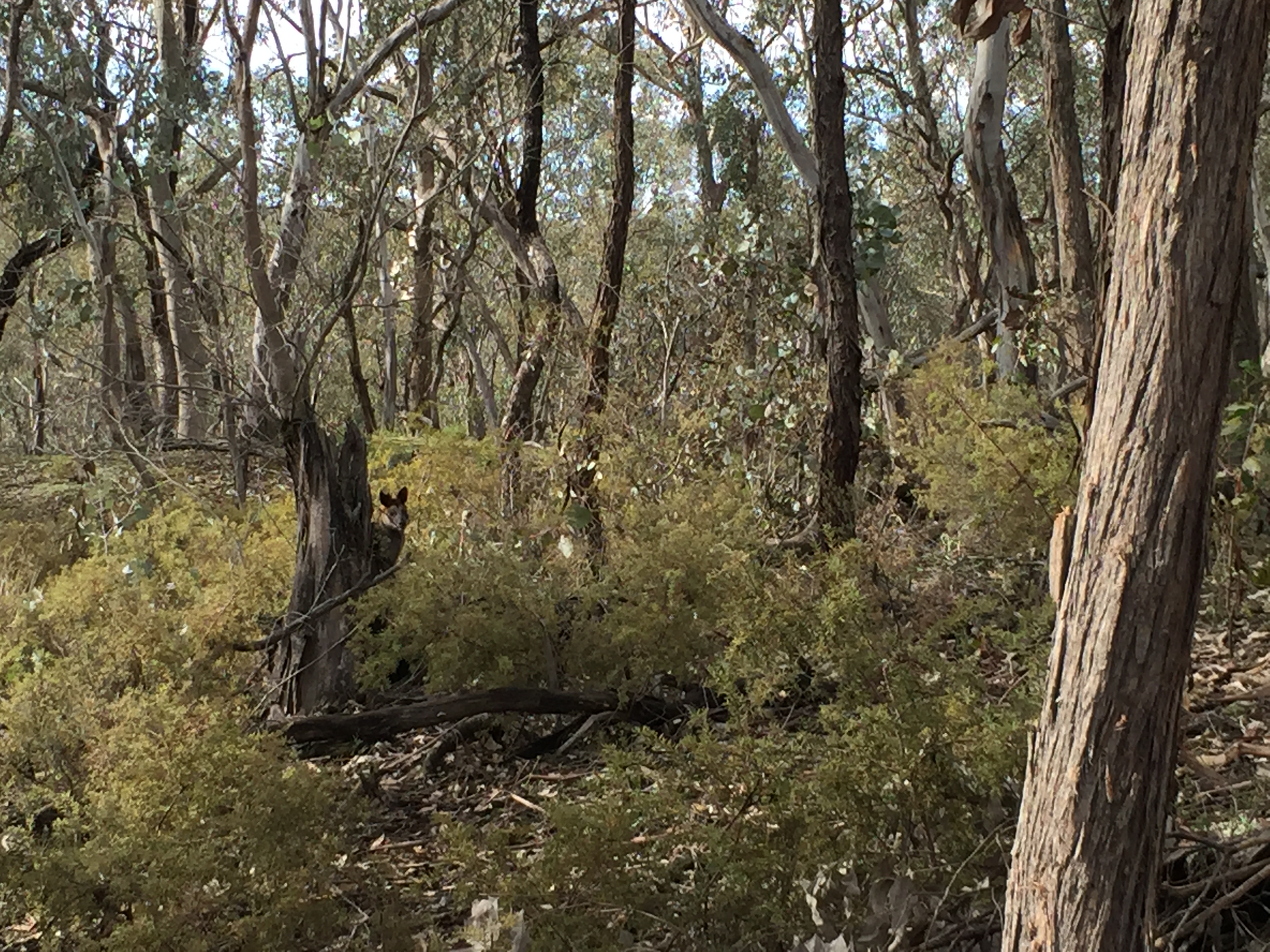 The forest itself was open, with a fairly high canopy. The only understory was the occasional acacia or cypress/pine, and the ground cover was mainly grasses, tiny ferns and low herby things. (A botanist I am not!) The character of the forest changed as we walked around the circuit, depending on whether we were in low gullies or up on the ridge lines, but throughout the whole park there were birds and kangaroos/wallabies. We even encountered one wallaby mum with quite a large joey in her pouch, which was lovely.